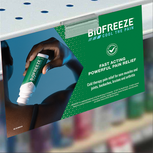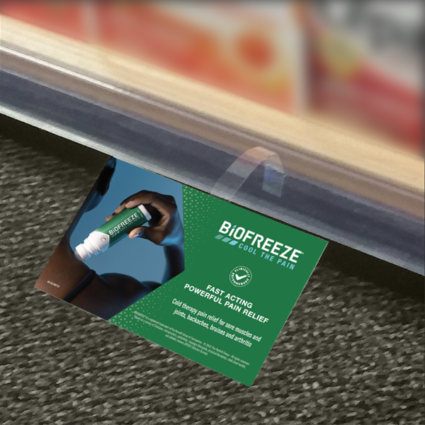 Biofreeze 4" W x 2.5" H, 4/0, Printed Sign - Can be used as a Flush Mount Sign or a Wobbler (main image of sign is shown with the EG-17-1-FMS, 2nd image is with sign used with 6060 wobbler)
